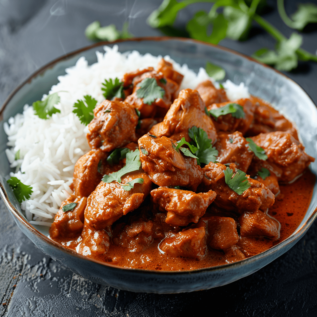 Tender chicken swims in a tomato flavoured sauce nade with sweet spices such as cumin, coriander and garam masala and finished with a big scoop of cream.